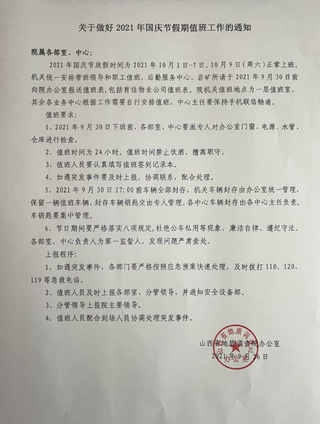 關(guān)于做好2021年國慶節(jié)假期值班工作的通知