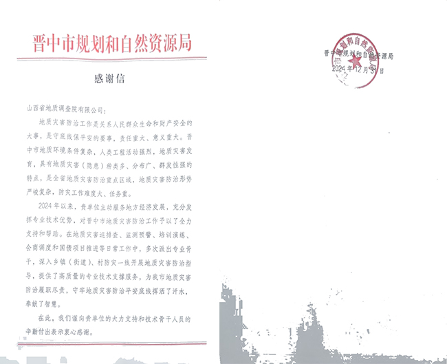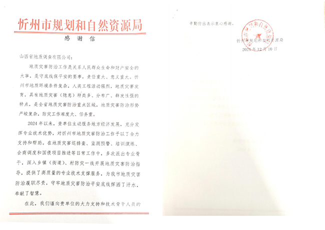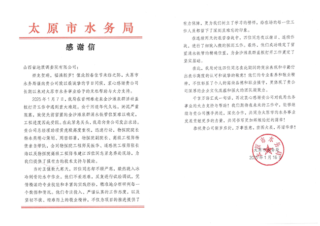 近期,公司收到來自政府、地方以及行業(yè)部門等多方的感謝信,信中均對地調(diào)院有限公司專業(yè)能力、人才實力與社會責任感給予了高度贊揚。